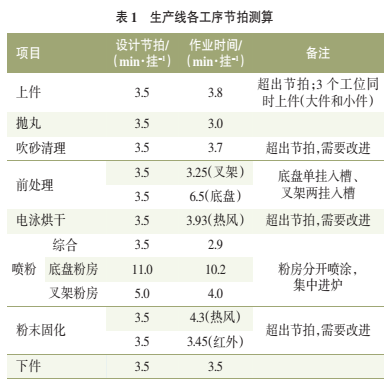 整改措施:1)針對換粉發(fā)現(xiàn)的影響節(jié)拍問題,通過與技術(shù)工藝人員現(xiàn)場試驗(yàn)并分析,結(jié)合噴粉供粉系統(tǒng)及輸送特點(diǎn),指定了可視化的換粉操作步驟,同時(shí)形成標(biāo)準(zhǔn)作業(yè),對員工進(jìn)行培訓(xùn),減少了因換粉導(dǎo)致的節(jié)拍浪費(fèi),由原來1.5 h降低到目前的0.5h。2)由于在換粉過程中,此粉房屬于停線狀態(tài),因生產(chǎn)線為大小兩個(gè)粉房,通過對每個(gè)粉房的操作節(jié)拍進(jìn)行測算兩個(gè)粉房的生節(jié)拍分別為10.5 min/掛、4.0min掛,為保證整體節(jié)拍滿足3.5min,可通過排產(chǎn)時(shí)將上線計(jì)劃進(jìn)行調(diào)整,將特殊顏色產(chǎn)品單獨(dú)進(jìn)一個(gè)粉房,在特殊顏色中間穿插6掛正常顏色,在特殊顏色進(jìn)行換色時(shí),將特殊顏色工件倒入換粉粉房前貯存區(qū),給后續(xù)正常顏色工件騰出輸送路線,數(shù)量根據(jù)粉房前貯存區(qū)大小確定,這樣可實(shí)現(xiàn)正常顏色在換粉的0.5 h內(nèi)繼續(xù)轉(zhuǎn)移至另外一個(gè)粉房,實(shí)現(xiàn)粉房的正常運(yùn)行,從而保證整體節(jié)拍依然能夠滿足整體產(chǎn)線節(jié)拍要求。